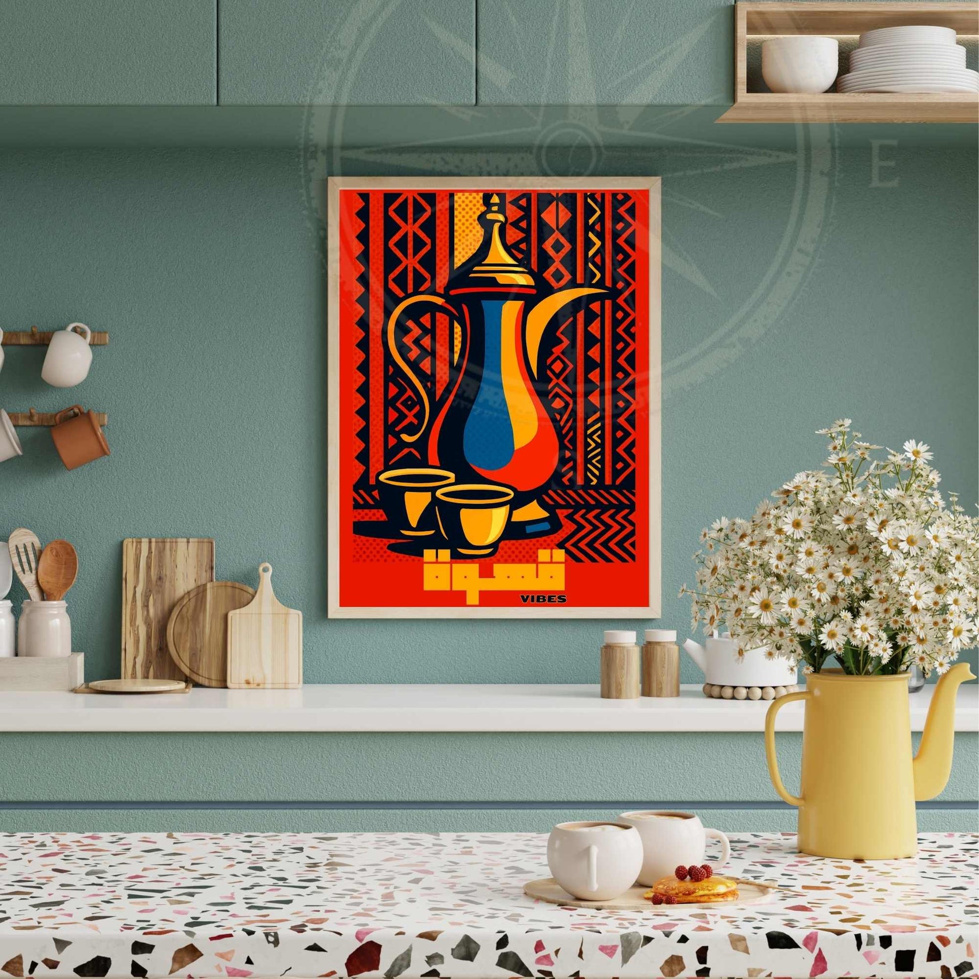 Cette affiche art café arabe traditionnel rend hommage à un rituel emblématique des cultures arabes : le service du café. Au centre de la scène, une cafetière aux courbes généreuses se dresse fièrement, accompagnée de deux petites tasses sur fond de motifs géométriques orientaux.