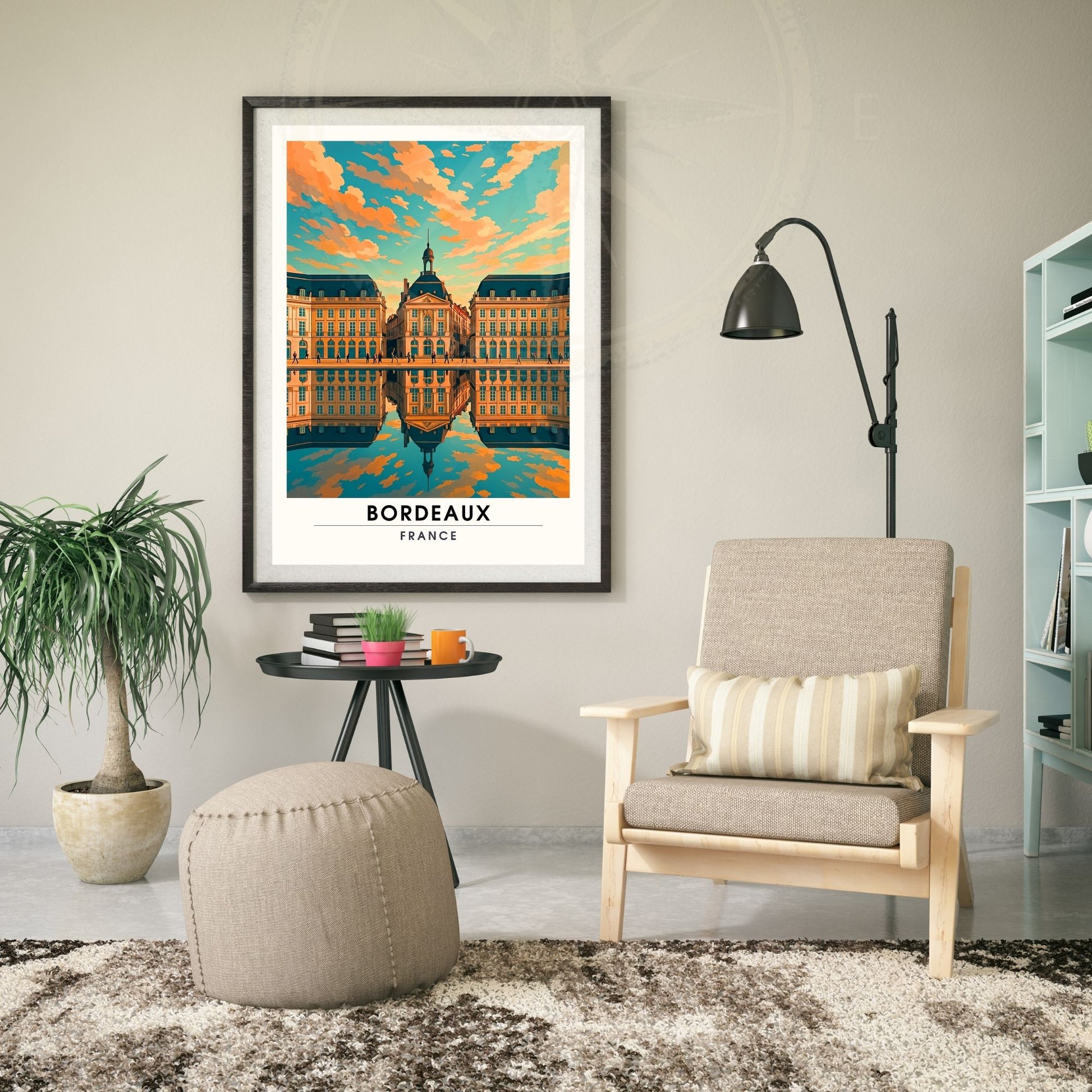 Pour une mise en valeur réussie, associez cette affiche Bordeaux à des matériaux comme le bois clair, le lin ou la pierre naturelle. Vous pouvez également créer un mur thématique en la combinant avec d'autres affiches de voyage représentant les villes françaises que vous aimez.