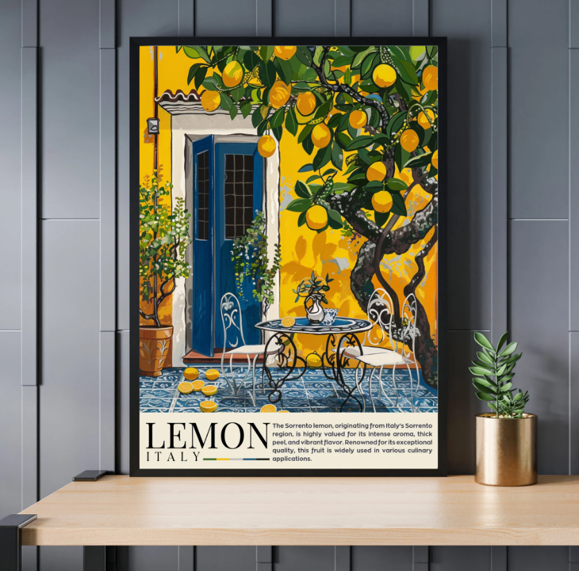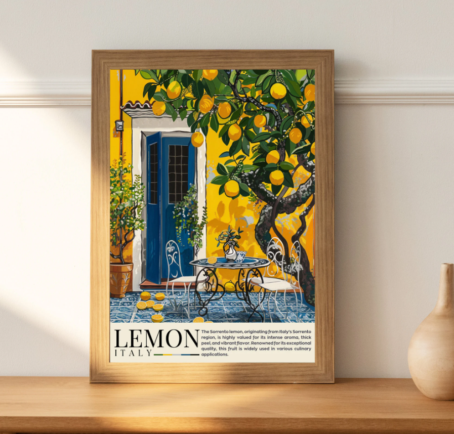 Bien plus qu'une simple décoration murale, cette affiche célèbre la tradition et le goût du citron de Sorrente.