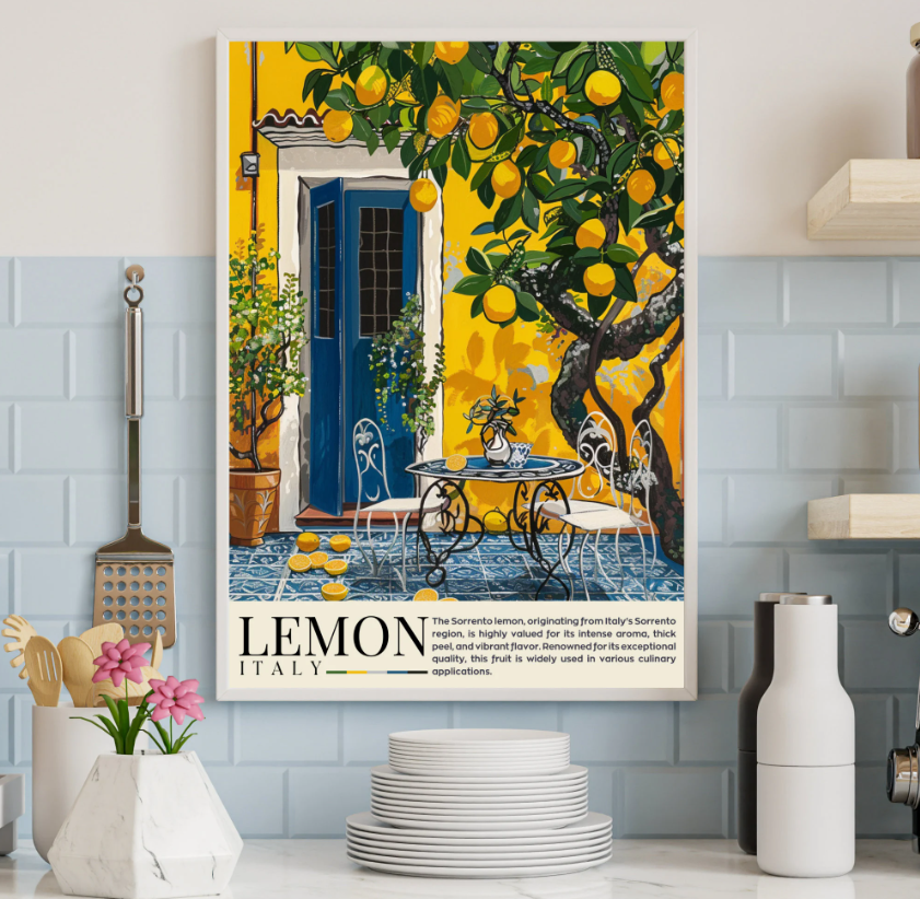 Art Inspirant pour la Cuisine : Cette affiche ne se contente pas de décorer, elle inspire également l'amour de la cuisine méditerranéenne et évoque les plaisirs de savourer un délicieux citron de Sorrente.
