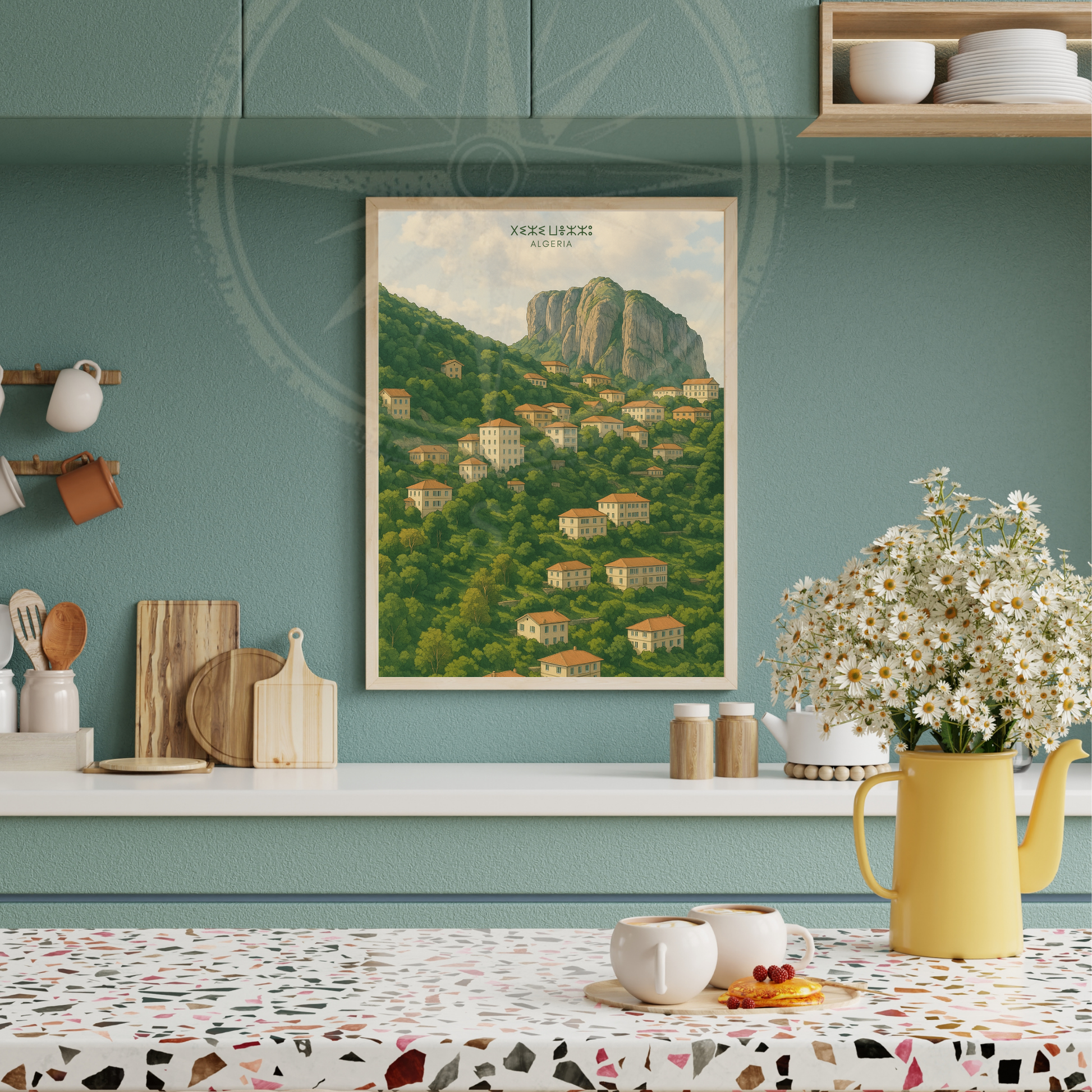 À travers cette illustration, on ressent la douceur du climat montagnard, l’hospitalité légendaire des habitants, et la richesse d’une région entre artisanat, musique et nature. Une véritable ode visuelle à l’Algérie du Nord.